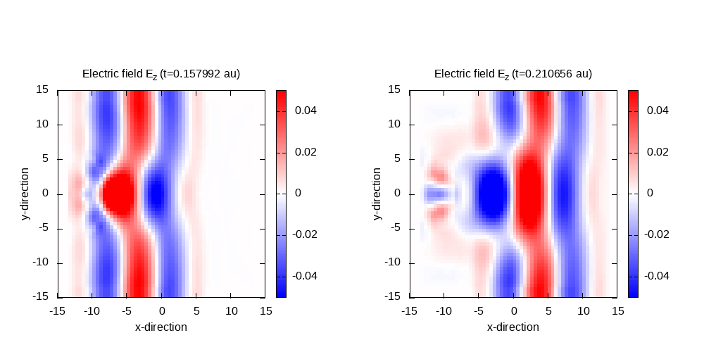 As a linear medium will scatter waves in all directions, there need to be absorbing boundary conditions to avoid spurious reflections on the box boundaries. For this purpose, we change the MaxwellAbsorbingBoundaries block to mask in all directions, to damp the field at the boundaries by multiplying it with a scalar mask function. The width of this mask MaxwellABWidth is set to 5 Bohr.